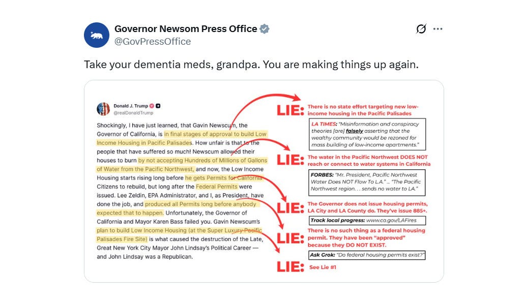 California Governor Gavin Newsom criticized Donald Trump over a lie-riddled Truth Social post about low-income housing, telling him to “take your dementia meds, Grandpa.” The comments highlighted Trump’s memory lapses and confusion, while his allies insist he is in peak condition.