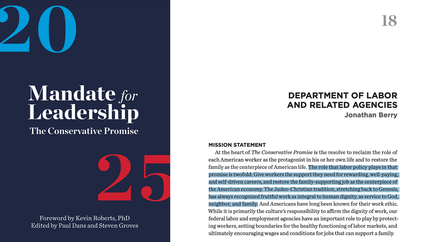 Project 2025 contains no proposals to strengthen workers' voices or make it easier to unionize. It doesn't support allowing the NLRB to fine companies that violate labor laws, a key provision of the PRO Act. Instead, the plan's labor section opens with a religious statement that quickly pivots to culture war issues, targeting diversity, equity, and inclusion (DEI) initiatives in the workplace. The entire chapter on labor only includes one single recommendation to raise workers' pay, suggesting overtime pay for work on the Sabbath, based on religious grounds.