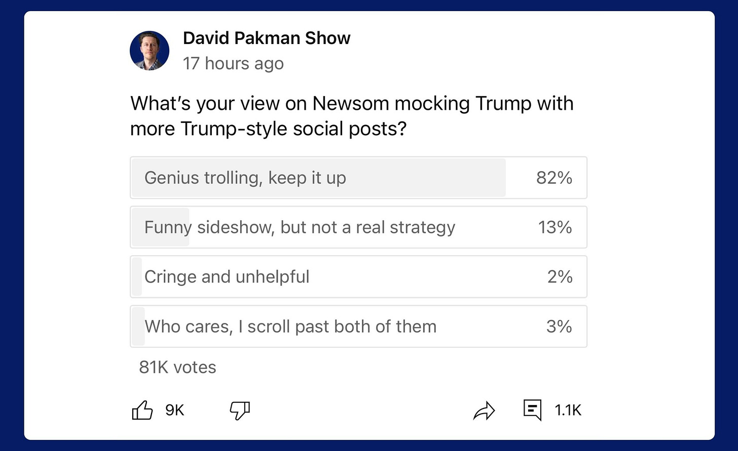 The convergence of redistricting and social media strategy tells us something important about where politics is headed. It is not just about policy wins. It is about refusing to concede the battlefield of attention. For years, Democrats have struggled to counter Trump’s ability to dominate every news cycle. Newsom’s experiment is one of the first real attempts to flip that script.
