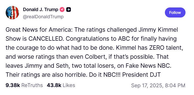 ABC has indefinitely suspended Jimmy Kimmel Live! following a controversial segment in which Kimmel satirized political reactions to the assassination of conservative activist Charlie Kirk. The network’s decision has sparked concerns about censorship and self-censorship, signaling a potential chilling effect on free speech and raising broader questions about media freedom, the First Amendment, and the pressures on broadcasters to avoid politically sensitive content. Donald Trump celebrated the suspension, framing it as a victory and claiming Kimmel has “ZERO talent.”