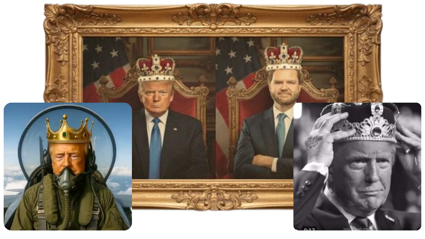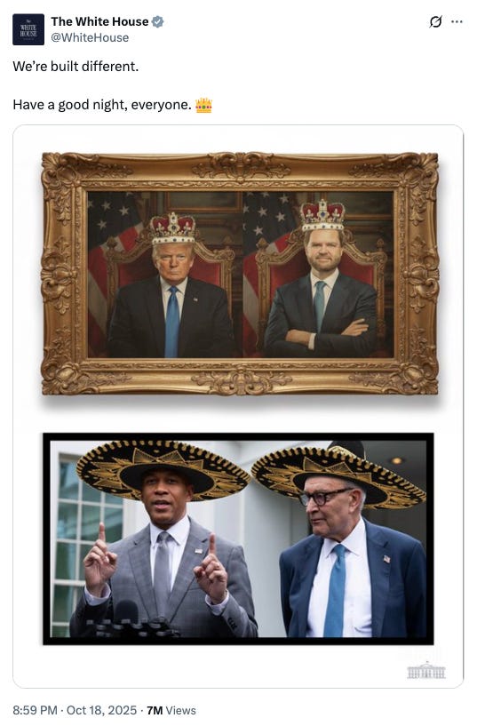One of them shows “King Trump” piloting a fighter jet and dumping feces (yes, poop) on protesters below. Another has Trump donning a crown while Democratic leaders are presented as literal supplicants. The official White House account even amplified the royal bit by posting imagery of Trump and Vance on thrones with crowns stacked over a racist gag of Democratic leaders in sombreros with the caption, “We’re built different. Have a good night, everyone. 👑”