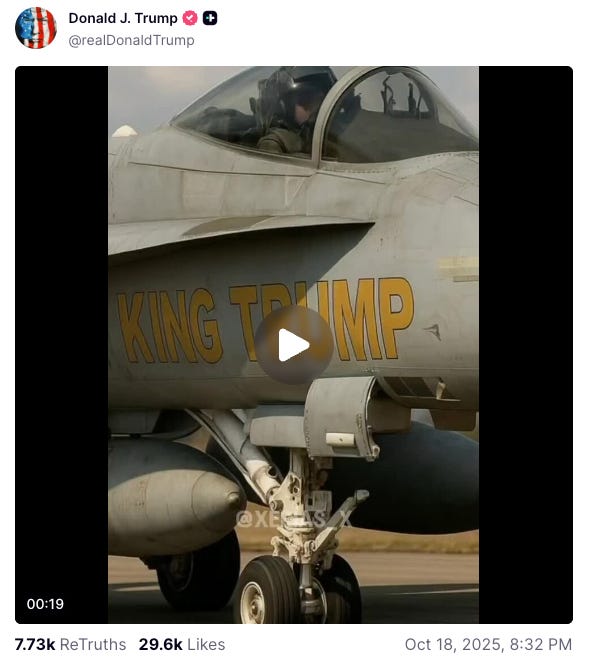 Trump posted an AI clip on Truth Social showing himself flying a military jet labeled KING TRUMP. In the video, he dumps feces onto protesters. The message is not subtle. Dissenters are targets.