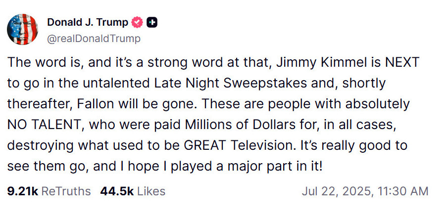 Donald Trump took credit for Stephen Colbert’s show cancellation and threatened other late-night hosts like Jimmy Kimmel and Jimmy Fallon. On Truth Social, he announced a $36 million settlement from CBS and 60 Minutes, calling it a win against “fake news.”