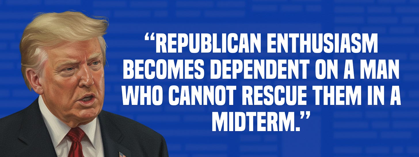 Either way, Republican enthusiasm becomes dependent on a man who cannot rescue them in a midterm.