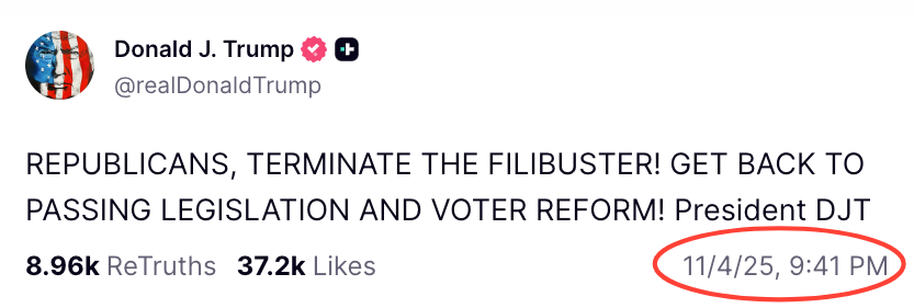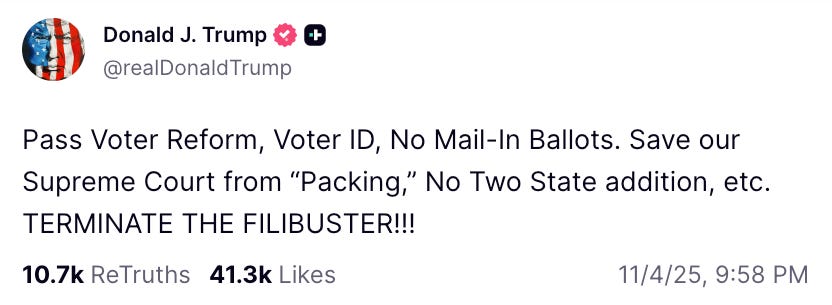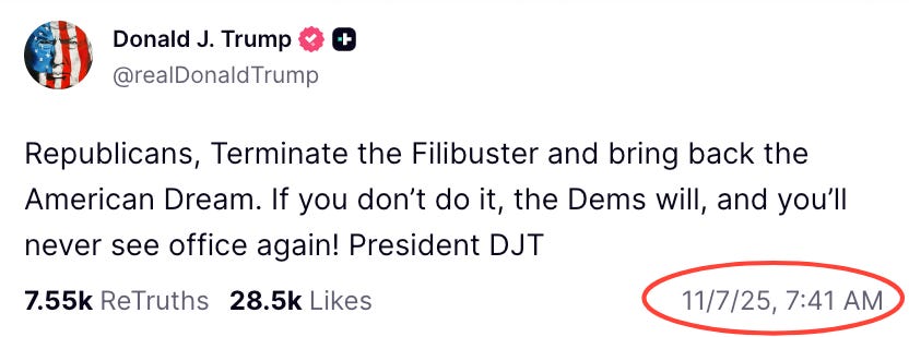 We are now thirty-something days into a government shutdown. Trump is admitting the shutdown hurt Republicans. Since Tuesday night, he’s been posting to Truth Social about ending the filibuster and reopening the government. By ending the filibuster, Republicans in the Senate could pass their continuing resolution with a simple majority vs. the 60-vote requirement typically needed in this situation. They have a simple majority (51 votes) in the Senate without needing a single Democratic vote. It’s their shutdown. Voters are furious about SNAP benefits being cut, federal workers not getting paid, and the general chaos that comes with a government shutdown.