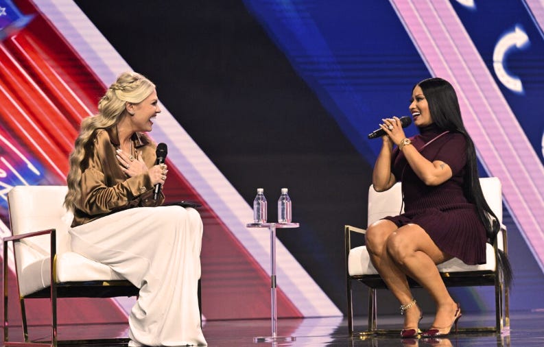 While praising Republican “role models,” Minaj referred to J.D. Vance as “the assassin,” then immediately realized she was speaking to the widow of a man who had been assassinated just months earlier. The moment froze. The correction came too late. It was deeply uncomfortable and surreal in a way that only these events seem capable of producing.