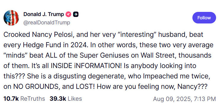 Trump has also renewed personal attacks on women who challenge him, including Congresswoman Jasmine Crockett and Nancy Pelosi. He disparaged Crockett with sexist insults questioning her intelligence and called Pelosi a “disgusting degenerate” over insider trading allegations.