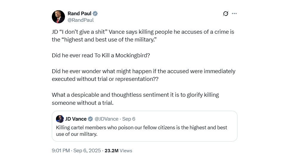 Even Rand Paul, who is hardly a paragon of democratic values, criticized Vance pointing out the absurdity of celebrating executions without trial.